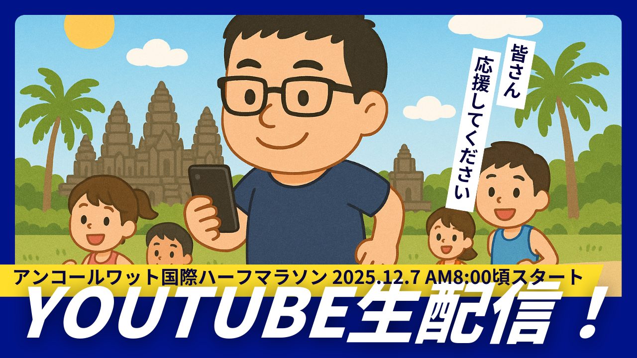 2025年12月7日 AM7:30頃からアンコールワット国際ハーフマラソンで走る様子をYouTubeで生配信します。